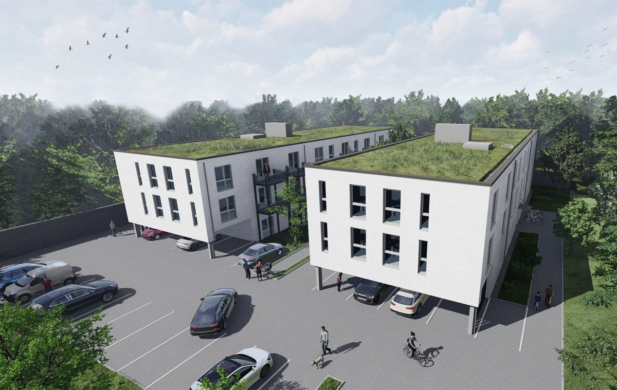 Die Planung sieht ein attraktives Wohnquartier um einen Kommunikationshof vor, das aus zwei Mehrfamilienhäusern mit einer Fassadenbegrünung zur Friedhofseite besteht. Die Kommunikation und alle Lebensräume sind in einen belebten Innenhof ausgerichtet. Dabei sorgen der begrünte Innenhof und zukunftsgerichtete Ausstattung für ein attraktives Lebensumfeld. Im Außenbereich runden PKW-Stellplätze sowie Fahrradstellplätze das Portfolio ab.